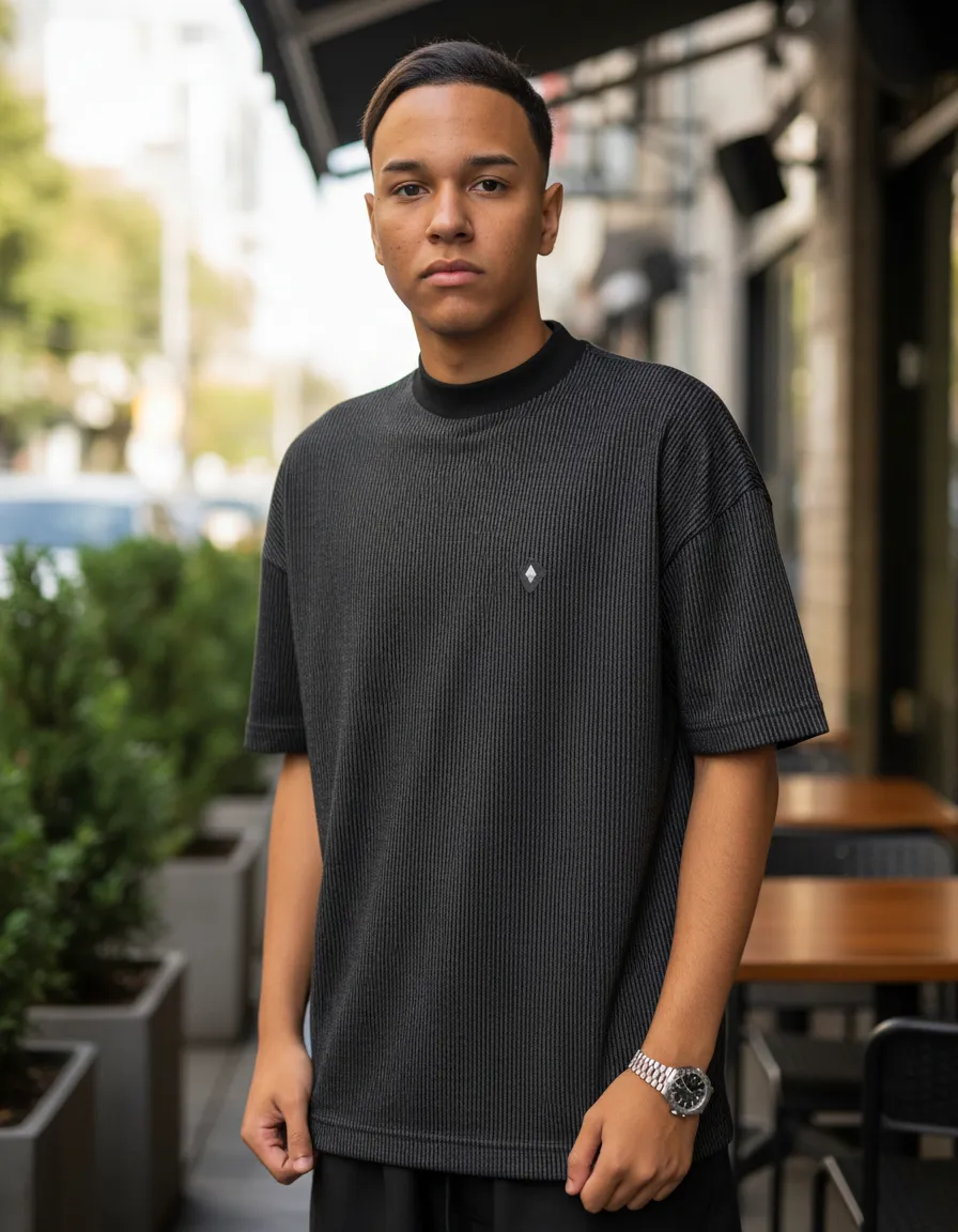 Camiseta Mcd feita em modelagem box fit, malha colete, logo espada na lateral do peito e etiquetas personalizadas.
