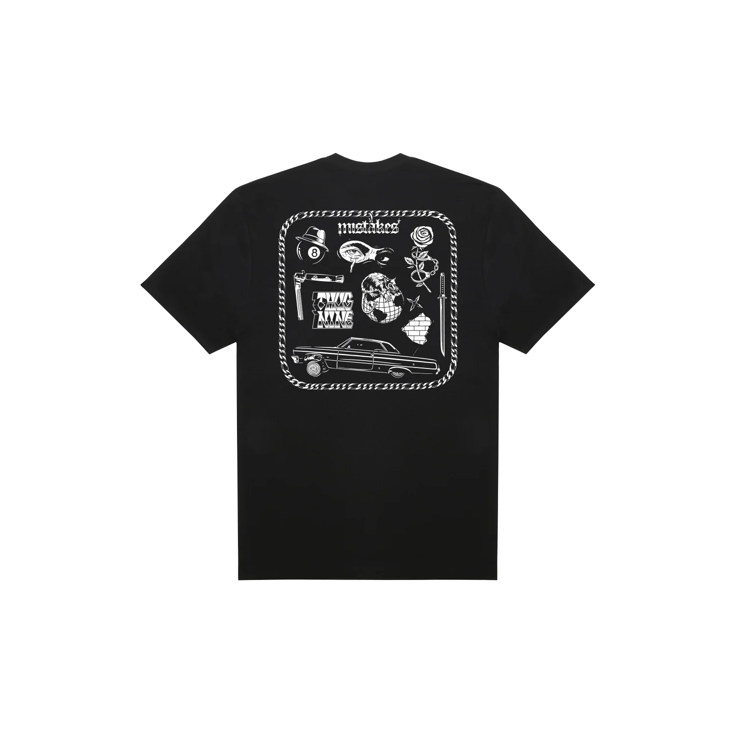 A estampa "Mistakes" traz, na parte frontal, o logotipo Thug Nine em composição oval, acompanhado por uma rosa estilizada em traço branco. Nas costas, o destaque fica por conta de uma arte repleta de elementos visuais como carro, flores, caveira, dados e corações despedaçados, todos contornados por uma moldura gráfica que reforça a estética retrô e simbólica da peça. A palavra “mistakes” aparece no topo, trazendo à tona reflexões sobre escolhas e consequências — com identidade e expressão visual urbana.