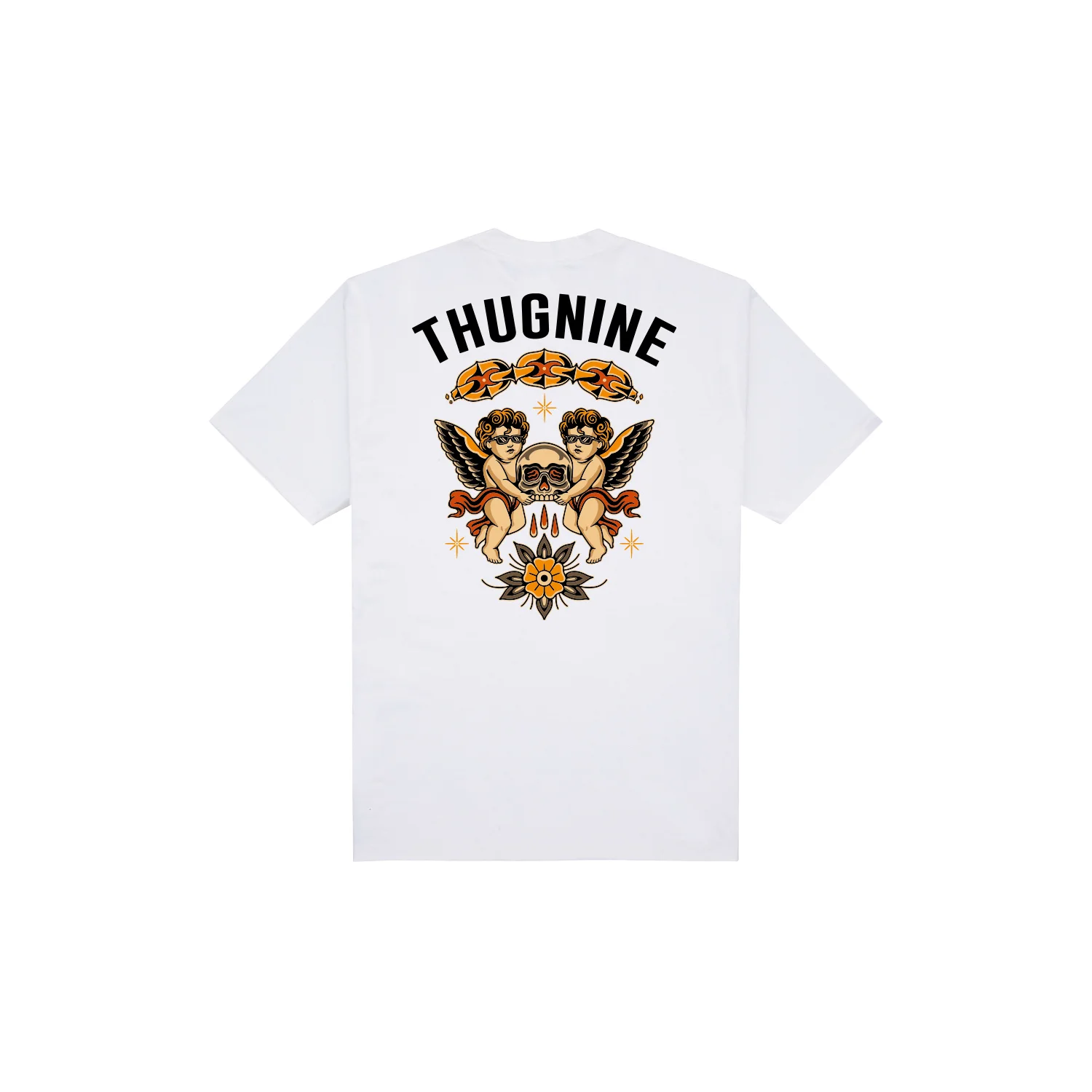 A ‘Bleeding Skull’ é apresentada na cor off-white e traz ilustrações marcantes nas regiões frontal e traseira. O destaque fica para a composição gráfica nas costas, que exibe duas caveiras com asas de anjo, cercadas por elementos florais e gotas. O nome da marca aparece em arco sobre a arte, trazendo identidade e impacto visual à peça.