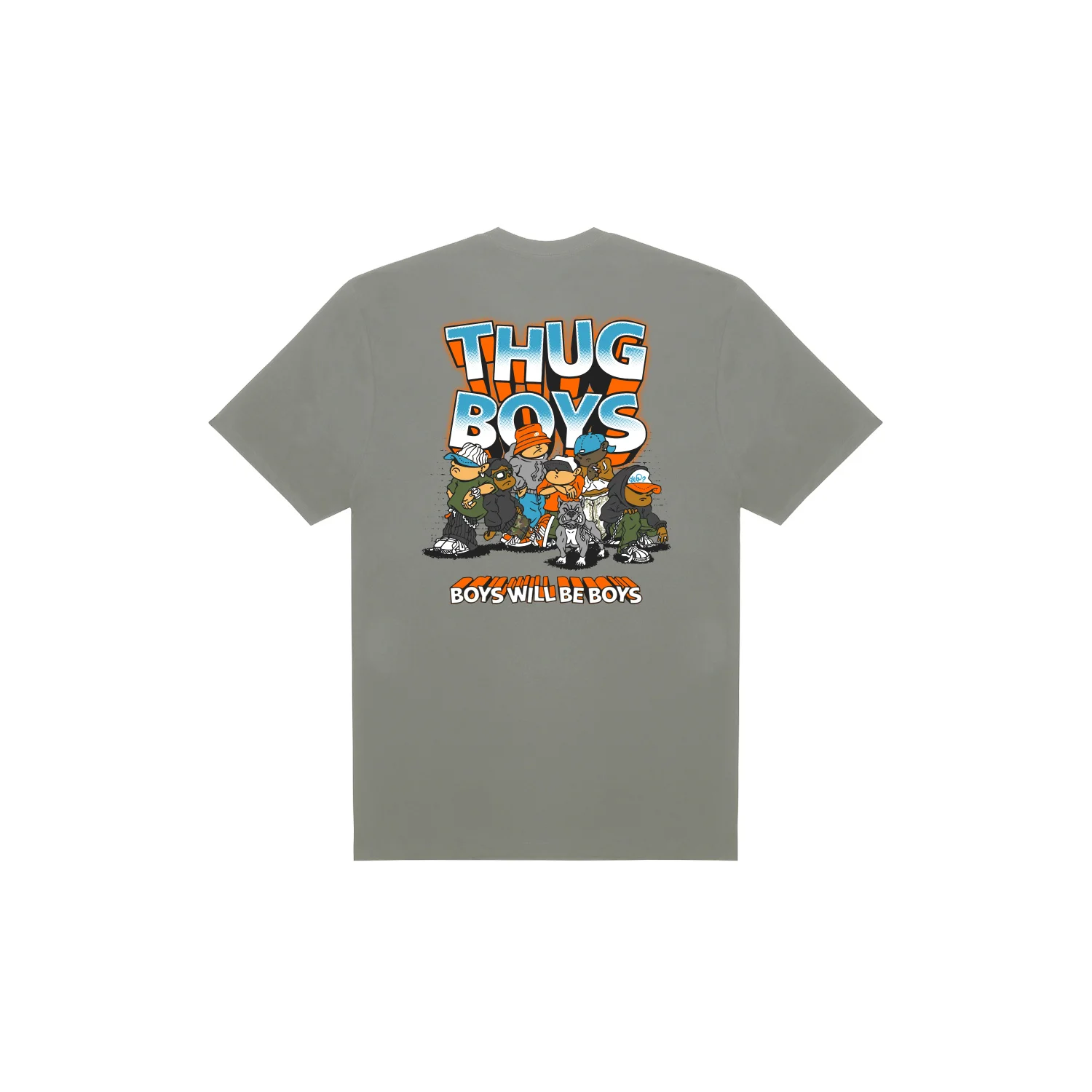 A estampa ""Thug Boys"" traz aplicação frontal com o nome da coleção em tipografia marcante acompanhada da frase “Boys will be boys”. Nas costas, a arte ganha destaque com ilustrações caricatas de personagens em estilo cartoon vestindo roupas urbanas, compondo um visual descontraído e cheio de personalidade.